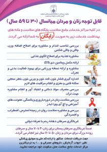 قابل توجه مردان و زنان میانسال (30 تا 59 ساله) ، شما می توانید با مراجعه به مراکز و خانه های بهداشت محل زندگی خود ، از خدمات بهداشتی مطابق تصویر بصورت رایگان استفاده نمایید.