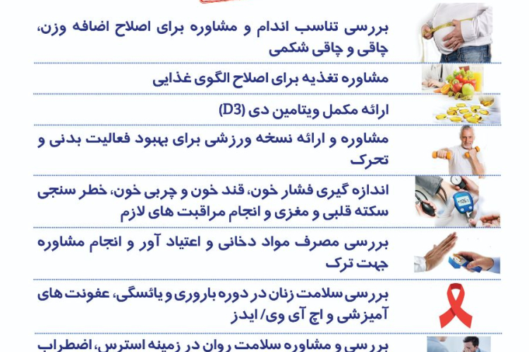 قابل توجه مردان و زنان میانسال (30 تا 59 ساله) ، شما می توانید با مراجعه به مراکز و خانه های بهداشت محل زندگی خود ، از خدمات بهداشتی مطابق تصویر بصورت رایگان استفاده نمایید.