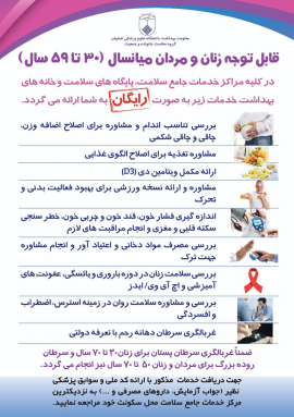 ارائه خدمات بهداشتی رایگان در خانه ها و مراکز قابل توجه مردان و زنان میانسال (30 تا 59 ساله) ، شما می توانید با مراجعه به مراکز و خانه های بهداشت محل زندگی خود ، از خدمات بهداشتی مطابق تصویر بصورت رایگان استفاده نمایید.
